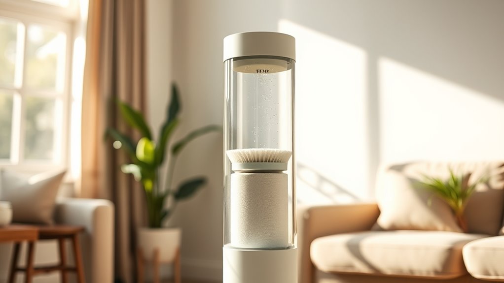 Like a gentle breeze, gravity-based air purifiers operate quietly, so you rarely notice their sound levels. Their operational noise is minimal, making them ideal for bedrooms or offices. You won’t be disturbed by loud motors or buzzing sounds. Instead, they work silently in the background, allowing you to breathe clean air without the distraction of noise. This quiet operation enhances comfort and peace in your living space.