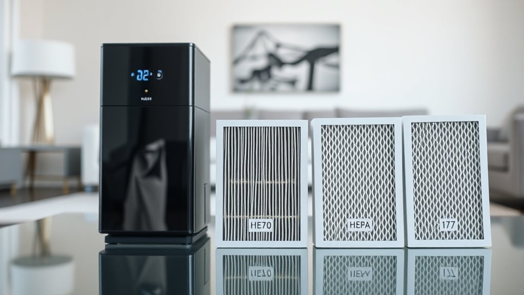 You might wonder if higher HEPA ratings are necessary for home use. The truth is, most everyday environments don’t demand the maximum filtration; a good quality HEPA filter with proper air purifier design often suffices. Keep in mind, higher ratings may mean more frequent filter replacements and increased energy use. So, assess your needs carefully—sometimes, a well-maintained, moderately rated filter provides clean air without the extra cost or effort.