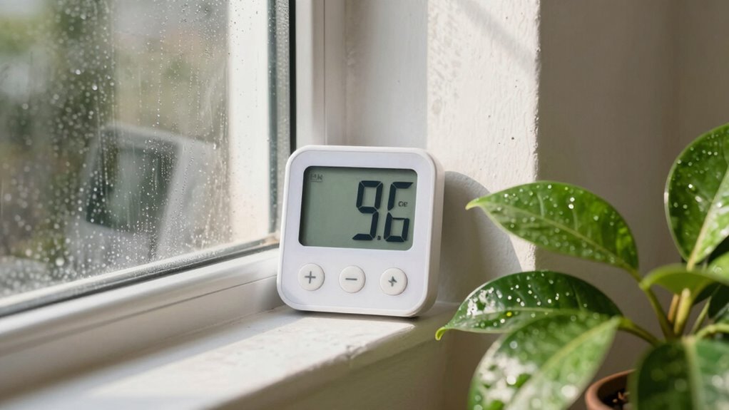 You should measure indoor humidity levels at least once a month to guarantee accuracy. Use a hygrometer and calibrate it regularly for reliable readings. Keep in mind seasonal humidity variation, as levels can fluctuate with weather changes. Regularly checking helps you maintain the ideal humidity range, preventing issues like mold or static. Monitoring often allows you to make timely adjustments for a comfortable, healthy environment.