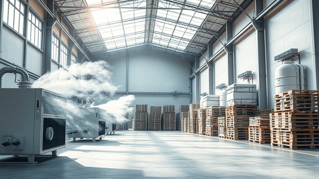 Maintaining good air quality in warehouses is essential for ensuring a safe and healthy environment for workers. Dust particles from materials like cement, wood, or stored goods can quickly accumulate, leading to poor air quality that affects health and safety. To combat this, implementing effective dust mitigation strategies is crucial. You should focus on reducing dust at its source, such as using enclosed storage to contain particles or applying wet suppression methods that prevent dust from becoming airborne. Regular cleaning schedules are vital, too, as they help remove settled dust before it becomes airborne again. Using industrial vacuums with HEPA filters ensures that dust is captured efficiently without recirculating it into the air. Incorporating dust mitigation techniques not only improves air quality but also minimizes slip hazards and equipment malfunctions caused by dust buildup. Additionally, integrating automation technologies can help monitor dust levels more consistently and alert staff to areas needing attention.