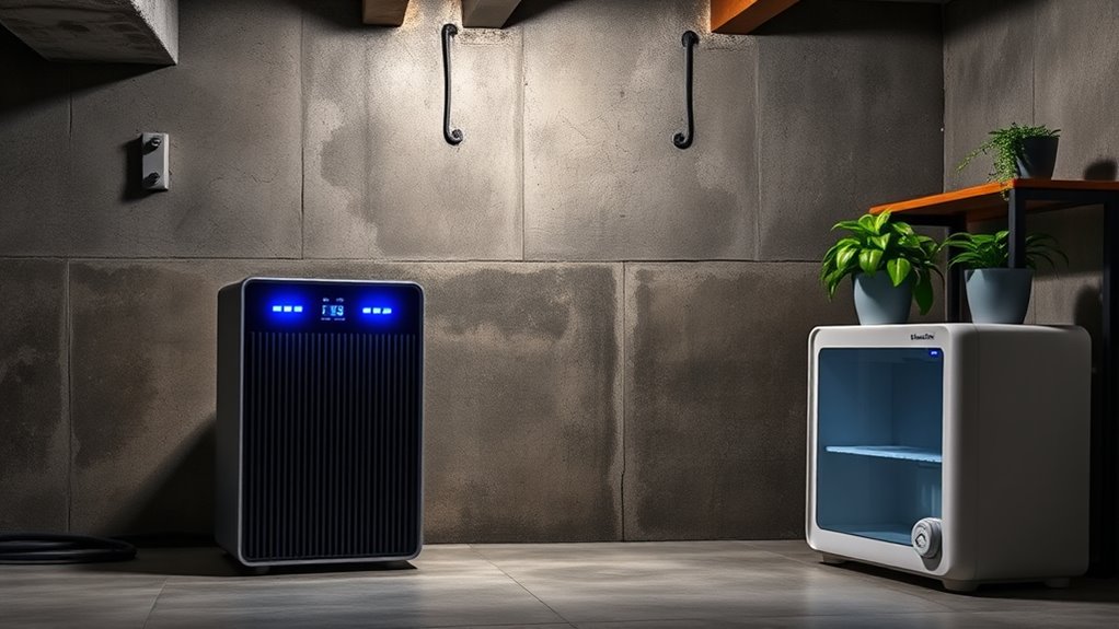 Start by identifying and sealing any leaks or cracks that let in outside moisture. Ventilation is vital—consider installing exhaust fans or an air exchange system to promote better airflow. When air circulates properly, it helps remove damp, stale air and replaces it with drier, fresher air from outside. You can also use dehumidifiers to maintain ideal humidity levels, ideally between 30% and 50%. Regularly empty and clean these devices to ensure they work efficiently. Keep in mind that humidity levels fluctuate with weather, so monitoring with a hygrometer can help you stay on top of your moisture control efforts.