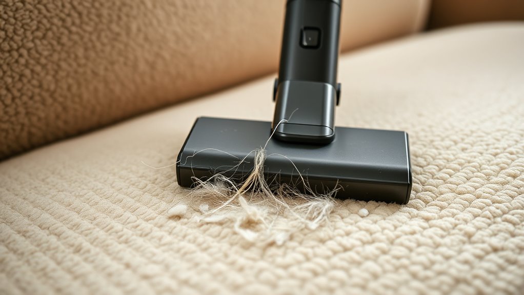 Pets bring joy into our homes, but their hair and dander can quickly become a persistent problem on carpets and upholstery. Tackling this issue requires more than just a quick sweep; it’s about using effective vacuum techniques and staying on top of pet grooming tips. When you vacuum, you want to focus on the right techniques to maximize removal. Instead of just passing the vacuum over a surface once, make slow, overlapping passes. This allows the brush roll or beater bar to lift hair and dander embedded deep in fibers. Use attachments like upholstery tools and crevice nozzles to target tricky spots, seams, and corners where pet hair tends to accumulate. Be sure to adjust your vacuum’s height setting to guarantee good contact with the surface—if it’s too high, it won’t pick up hair effectively, and if it’s too low, it could damage delicate fabrics. Regular vacuuming is key; ideally, you should do it at least two to three times a week, especially if you have multiple pets or shedding breeds.