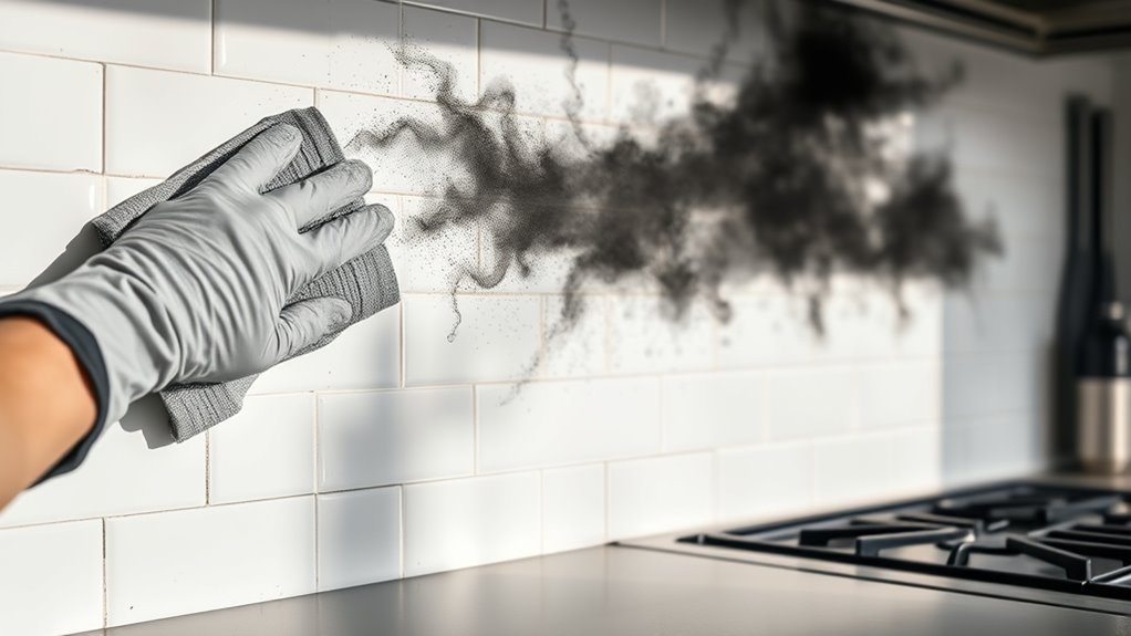 Smoke residue can cling stubbornly to walls, ceilings, and furniture long after the fire is out, but you don’t have to live with it. When a cooking mishap causes smoke to fill your kitchen, the lingering smell and residue can seem overwhelming. The first step is to implement effective ventilation strategies. Opening windows and doors creates cross-ventilation, helping to expel smoke particles from your space. Running exhaust fans or range hoods during and after cooking can also considerably reduce smoke buildup. If possible, use portable fans to direct fresh air inside and push smoky air out. These ventilation efforts are vital because they prevent smoke from settling deeply into surfaces, making subsequent cleaning easier.